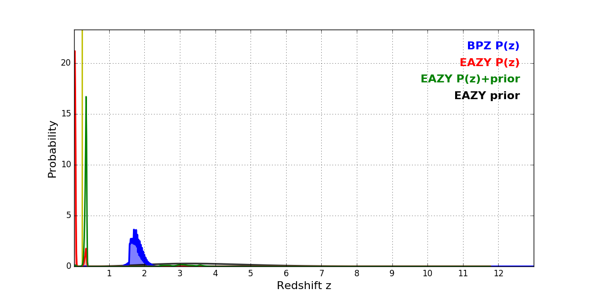 In P(z) plots: Yellow lines mark the cluster redshift z = 0.228,