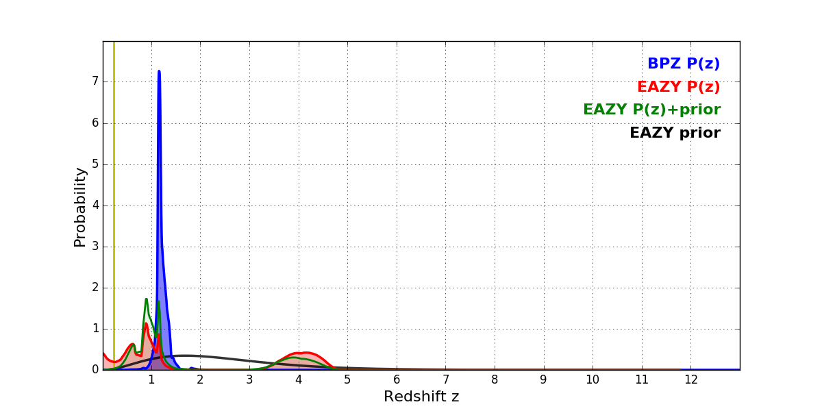 In P(z) plots: Yellow lines mark the cluster redshift z = 0.228,