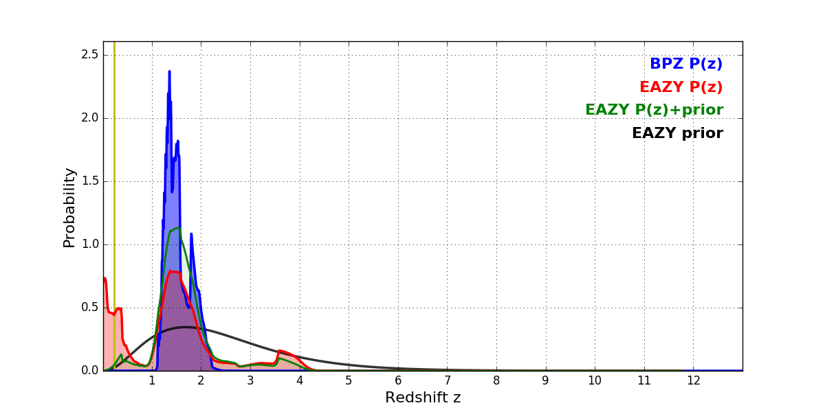 In P(z) plots: Yellow lines mark the cluster redshift z = 0.228,
