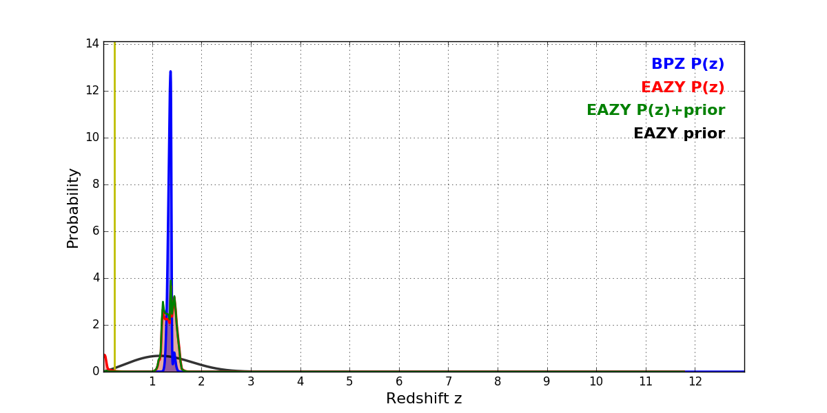 In P(z) plots: Yellow lines mark the cluster redshift z = 0.228,