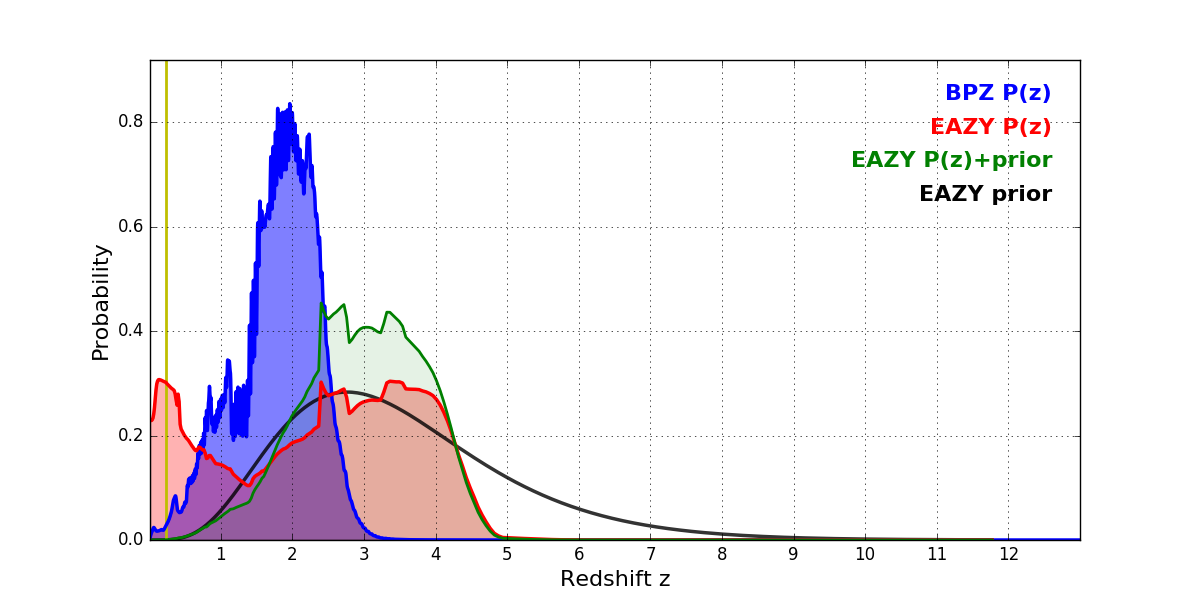 In P(z) plots: Yellow lines mark the cluster redshift z = 0.228,