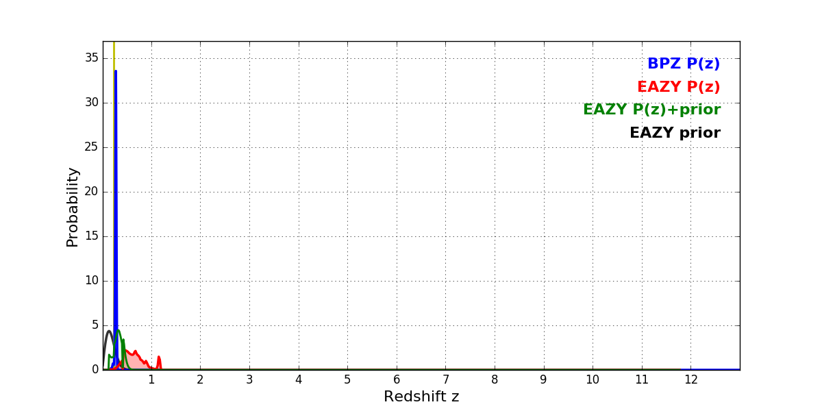 In P(z) plots: Yellow lines mark the cluster redshift z = 0.228,