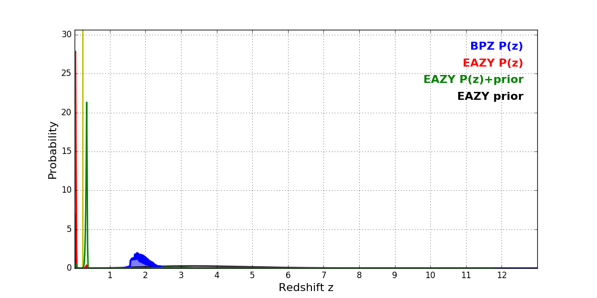 In P(z) plots: Yellow lines mark the cluster redshift z = 0.228,