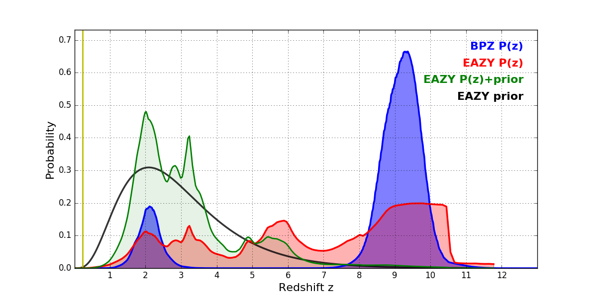 In P(z) plots: Yellow lines mark the cluster redshift z = 0.228,