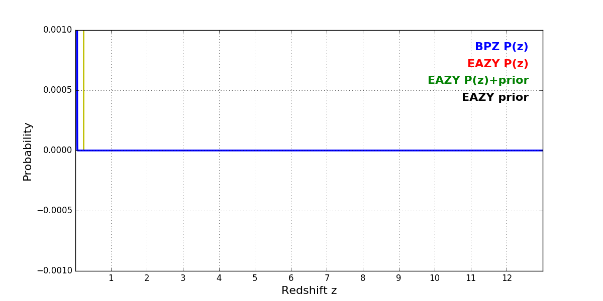 In P(z) plots: Yellow lines mark the cluster redshift z = 0.228,