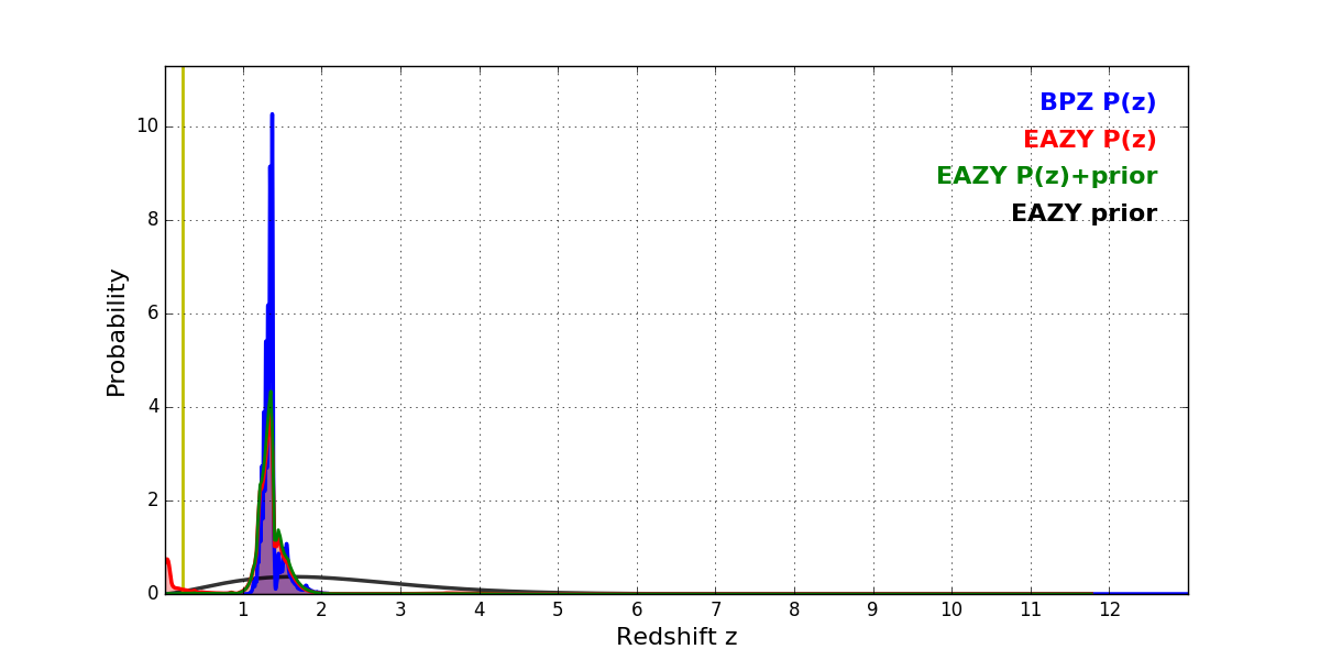 In P(z) plots: Yellow lines mark the cluster redshift z = 0.228,