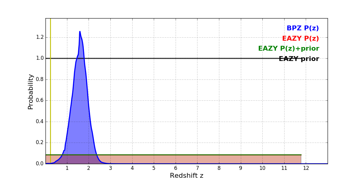 In P(z) plots: Yellow lines mark the cluster redshift z = 0.228,