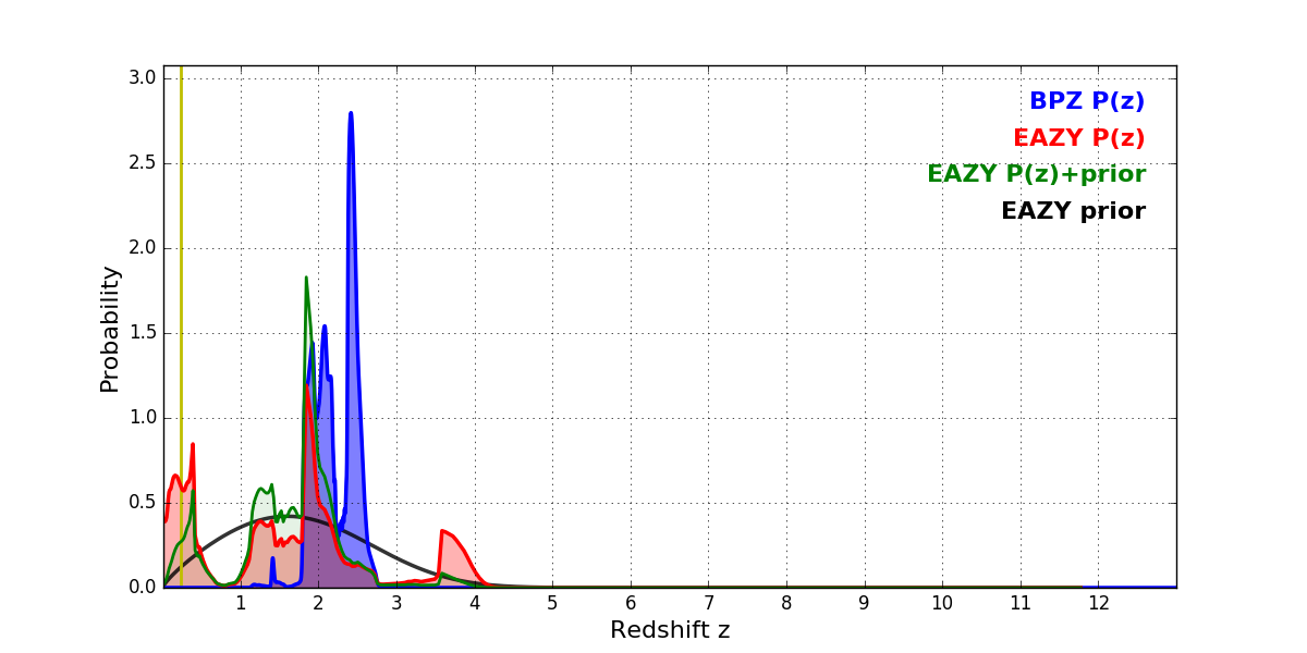 In P(z) plots: Yellow lines mark the cluster redshift z = 0.228,