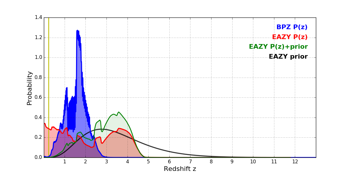 In P(z) plots: Yellow lines mark the cluster redshift z = 0.228,