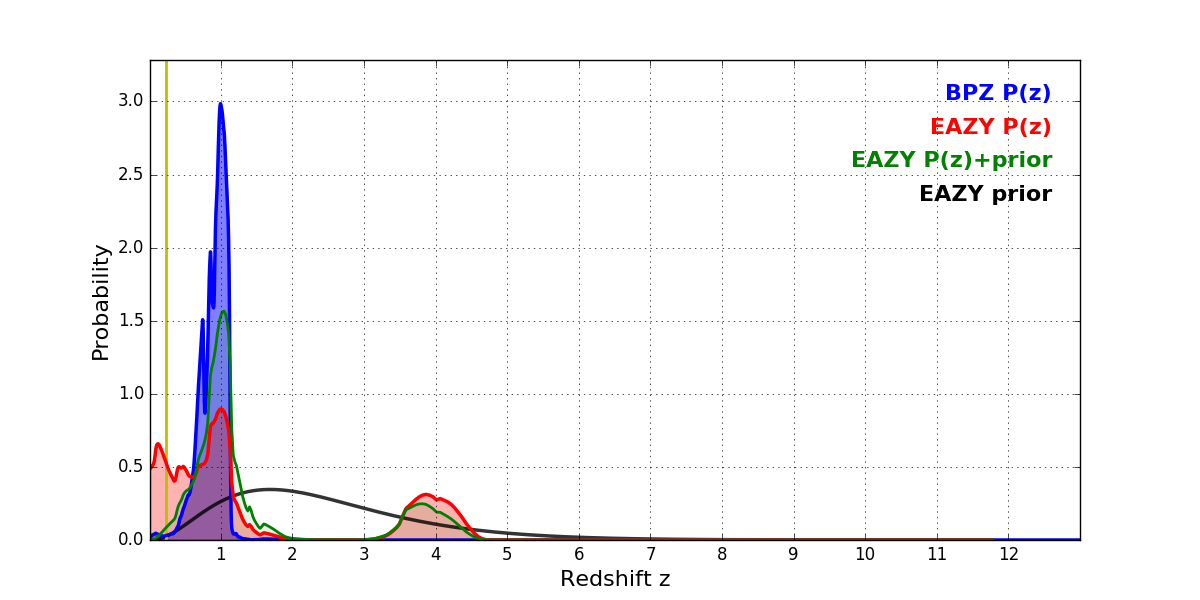 In P(z) plots: Yellow lines mark the cluster redshift z = 0.228,