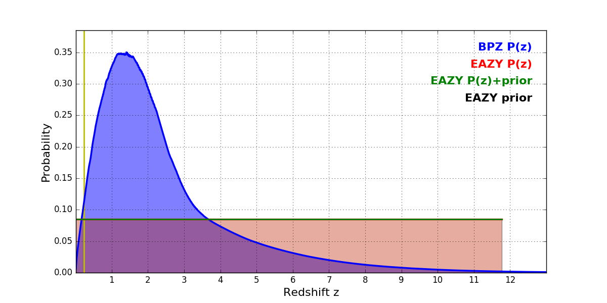 In P(z) plots: Yellow lines mark the cluster redshift z = 0.228,