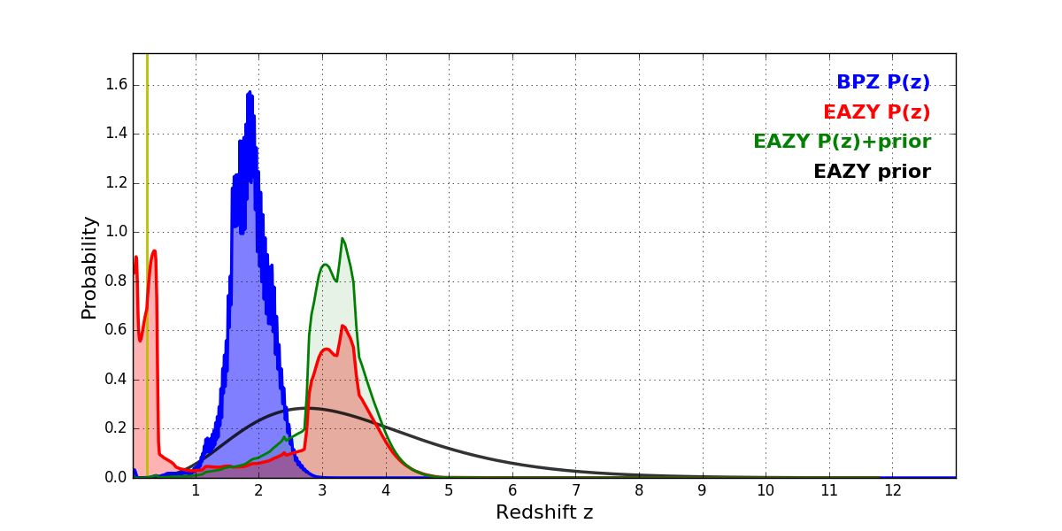 In P(z) plots: Yellow lines mark the cluster redshift z = 0.228,