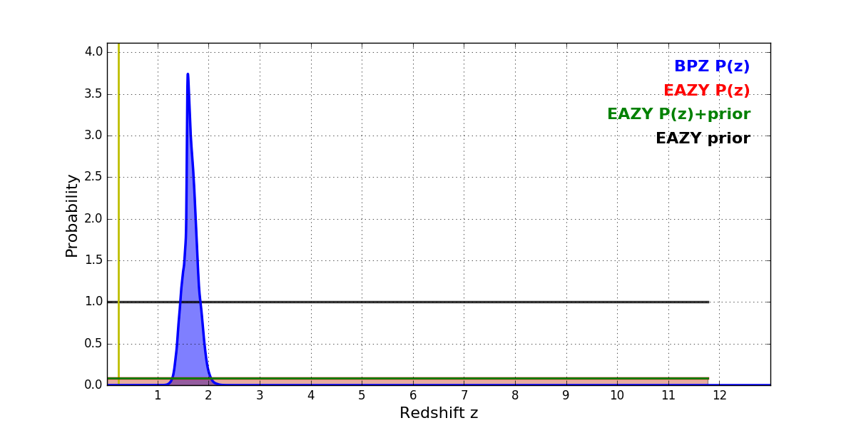 In P(z) plots: Yellow lines mark the cluster redshift z = 0.228,