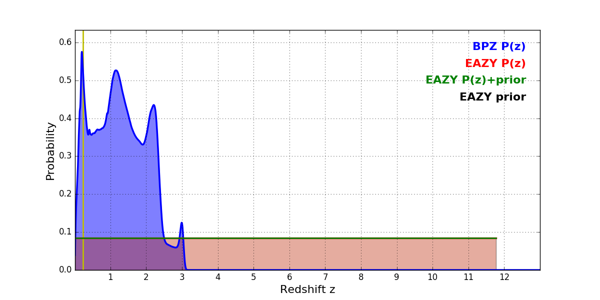 In P(z) plots: Yellow lines mark the cluster redshift z = 0.228,