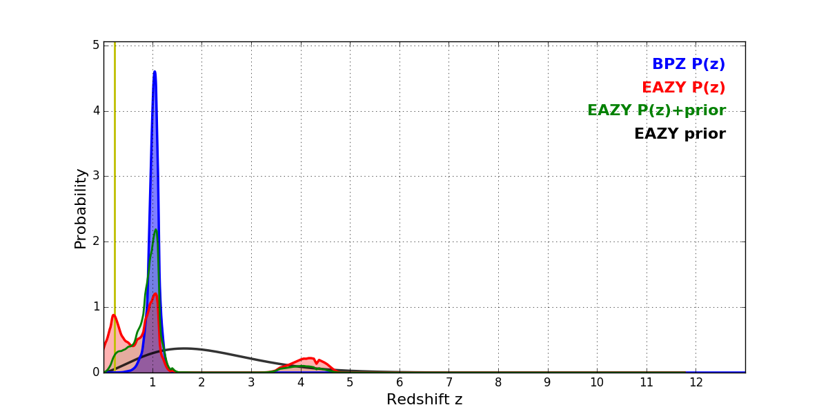In P(z) plots: Yellow lines mark the cluster redshift z = 0.228,