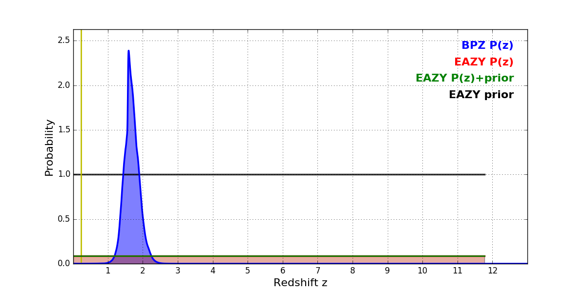 In P(z) plots: Yellow lines mark the cluster redshift z = 0.228,