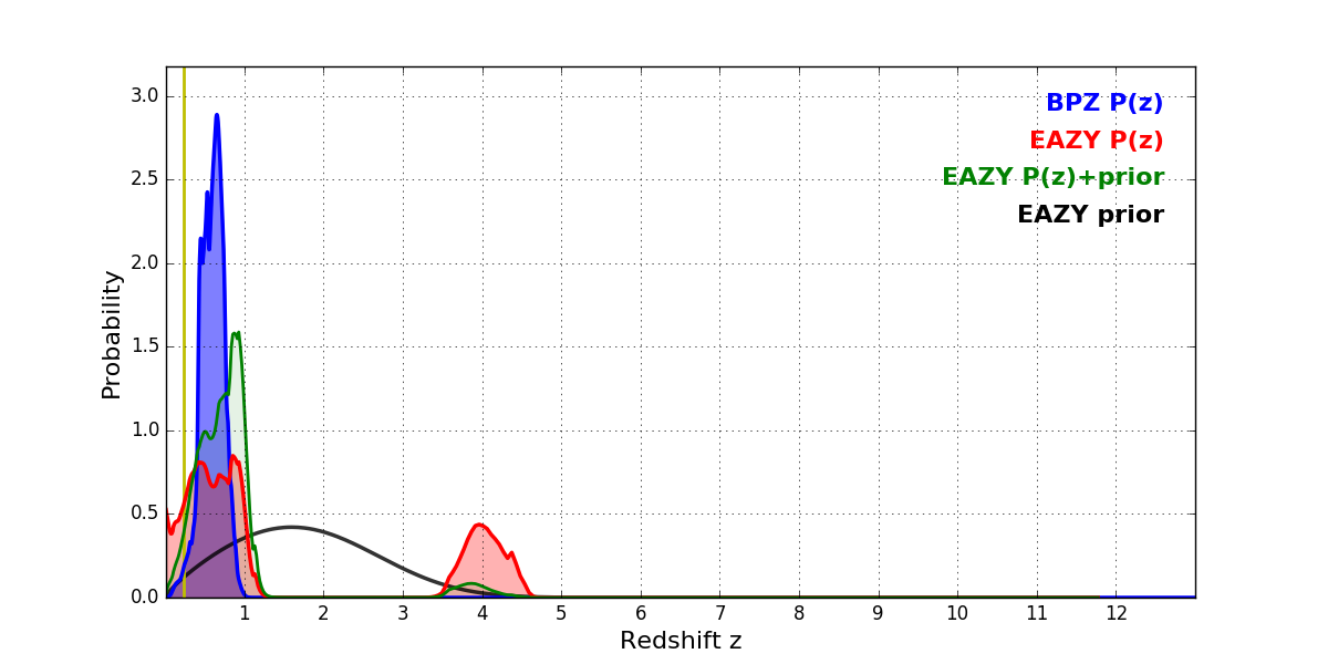 In P(z) plots: Yellow lines mark the cluster redshift z = 0.228,