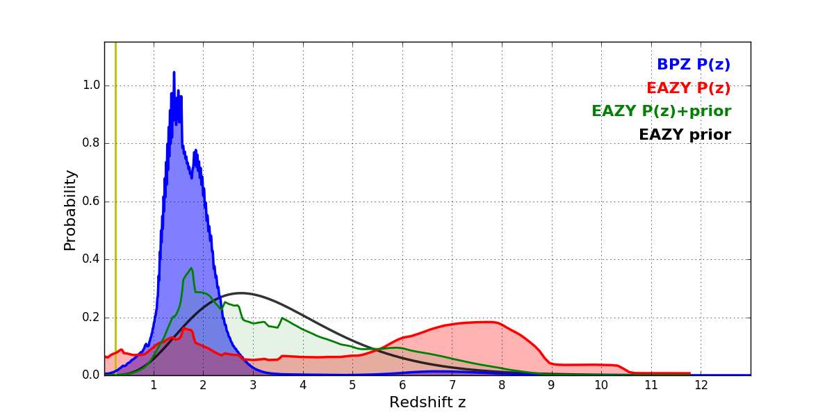 In P(z) plots: Yellow lines mark the cluster redshift z = 0.228,