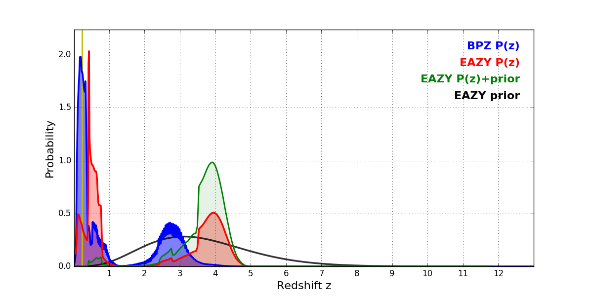 In P(z) plots: Yellow lines mark the cluster redshift z = 0.228,