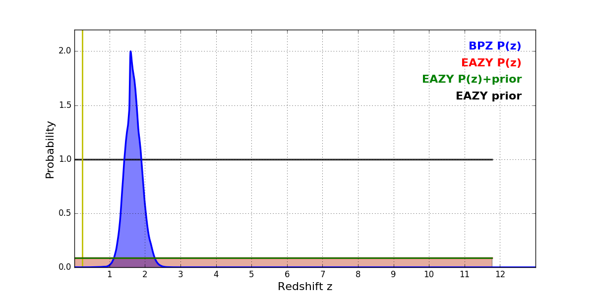 In P(z) plots: Yellow lines mark the cluster redshift z = 0.228,