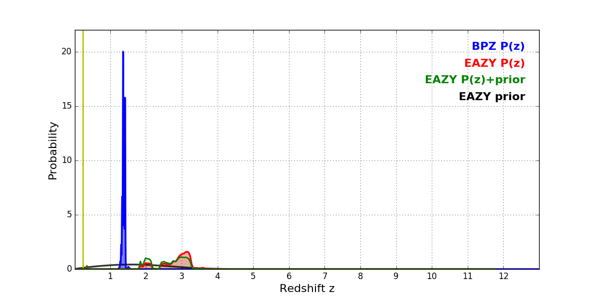 In P(z) plots: Yellow lines mark the cluster redshift z = 0.228,