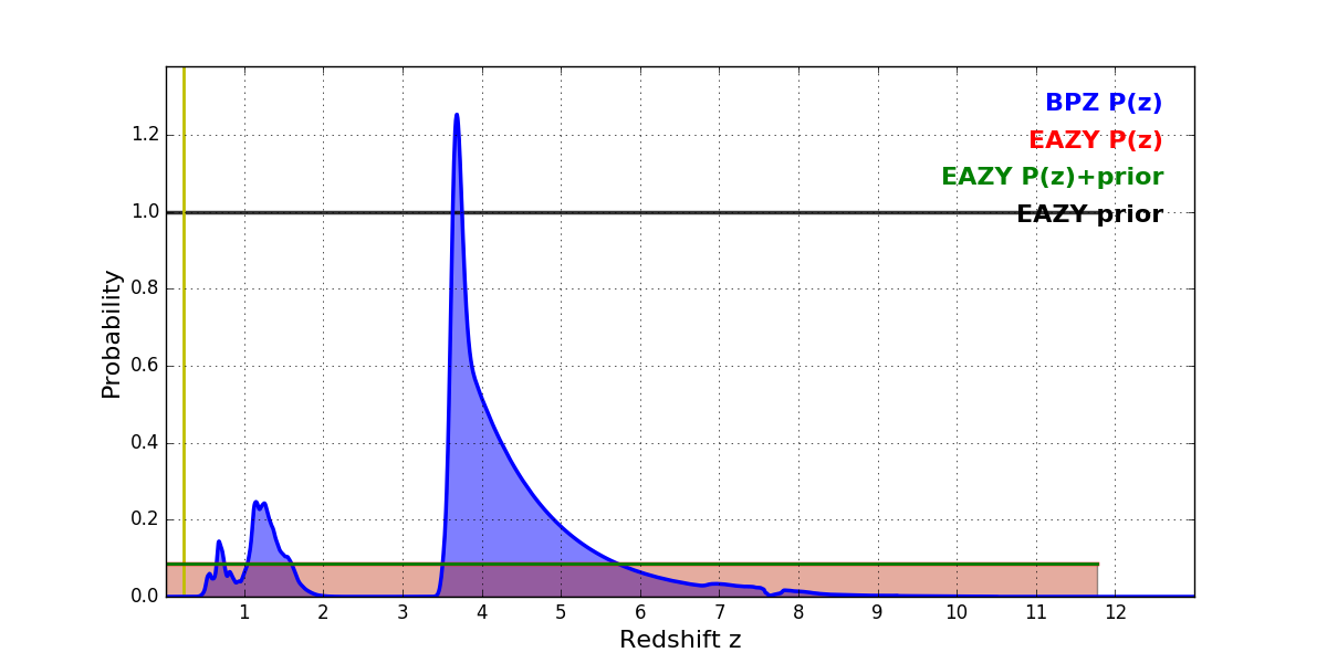 In P(z) plots: Yellow lines mark the cluster redshift z = 0.228,