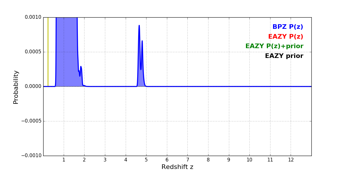 In P(z) plots: Yellow lines mark the cluster redshift z = 0.228,