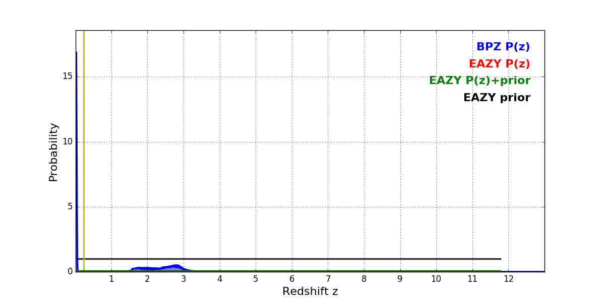 In P(z) plots: Yellow lines mark the cluster redshift z = 0.228,