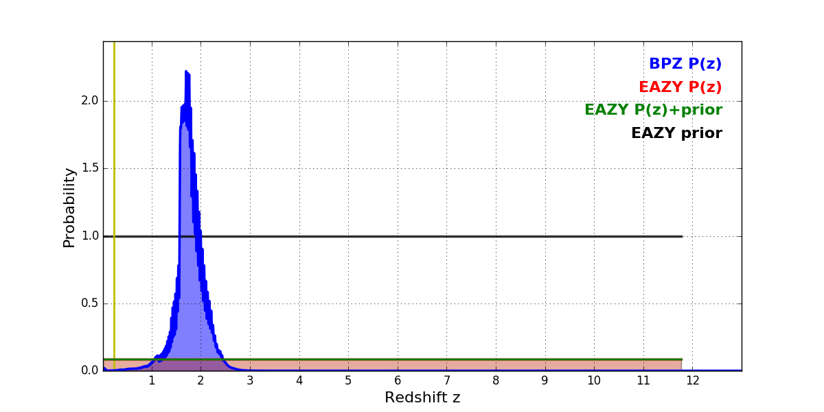 In P(z) plots: Yellow lines mark the cluster redshift z = 0.228,