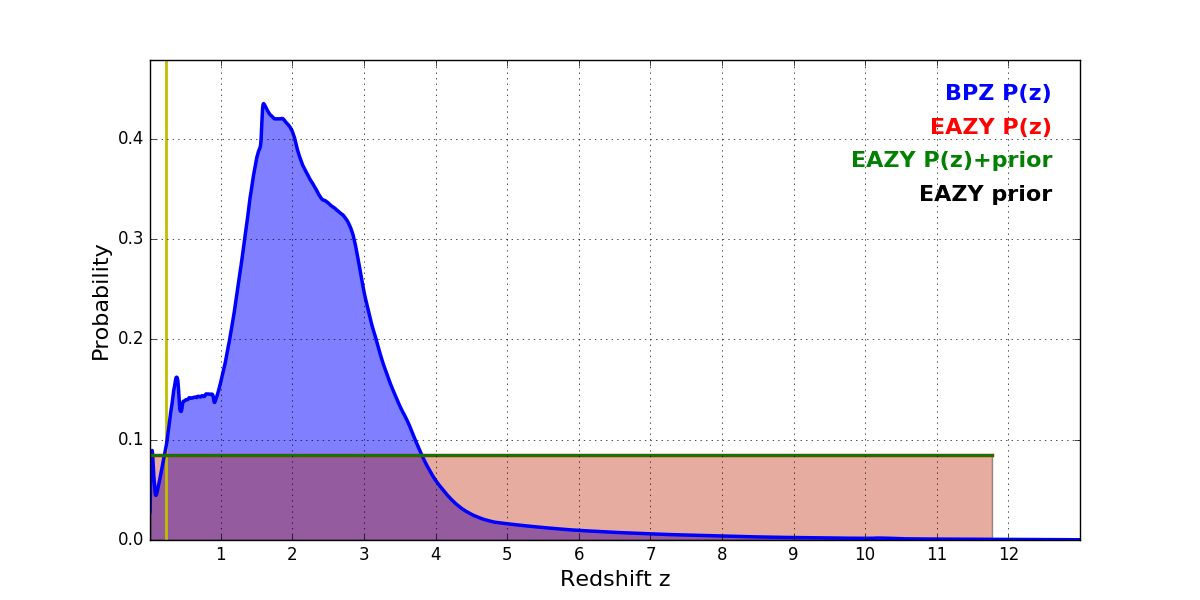 In P(z) plots: Yellow lines mark the cluster redshift z = 0.228,