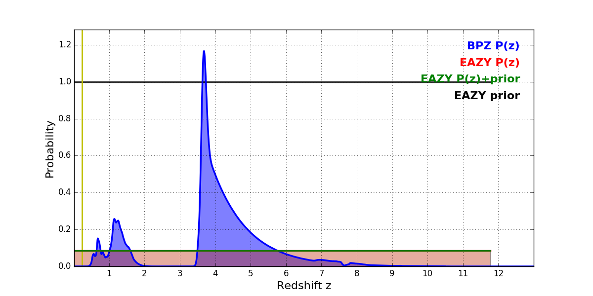 In P(z) plots: Yellow lines mark the cluster redshift z = 0.228,