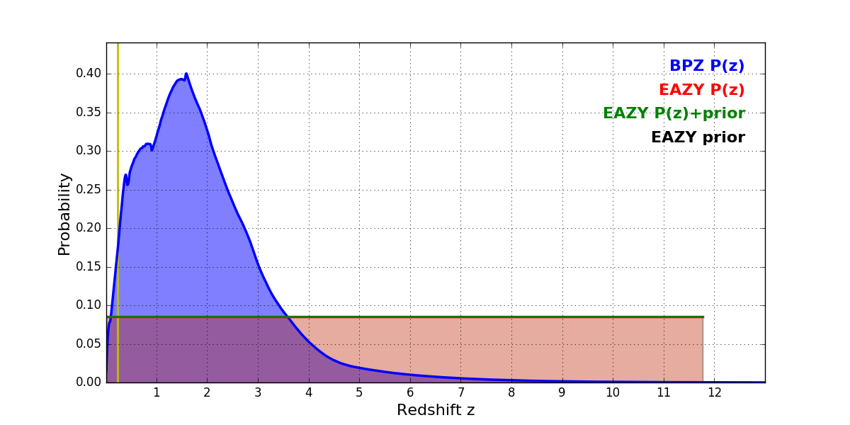 In P(z) plots: Yellow lines mark the cluster redshift z = 0.228,