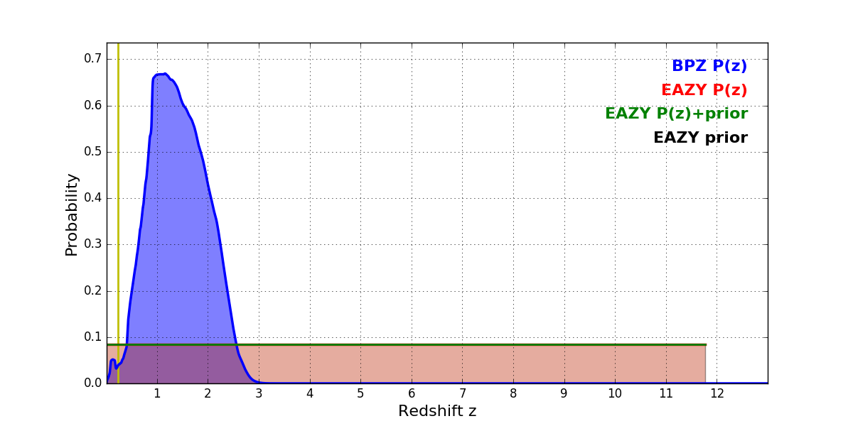 In P(z) plots: Yellow lines mark the cluster redshift z = 0.228,