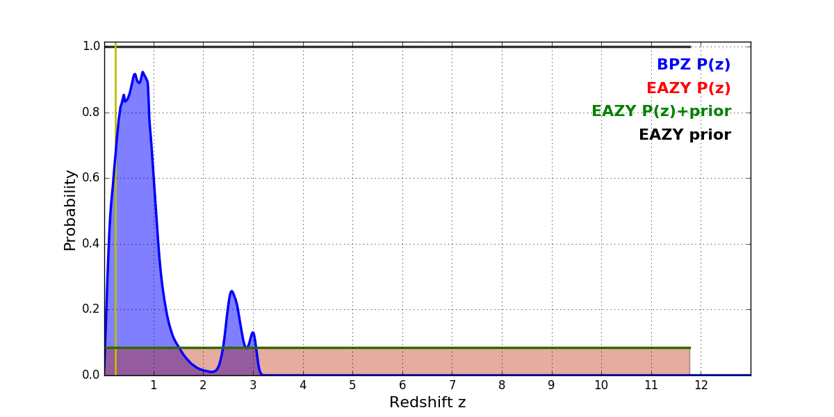 In P(z) plots: Yellow lines mark the cluster redshift z = 0.228,
