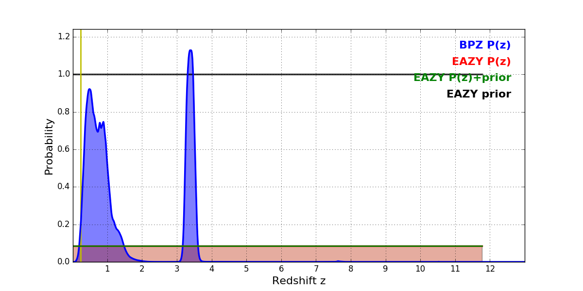 In P(z) plots: Yellow lines mark the cluster redshift z = 0.228,
