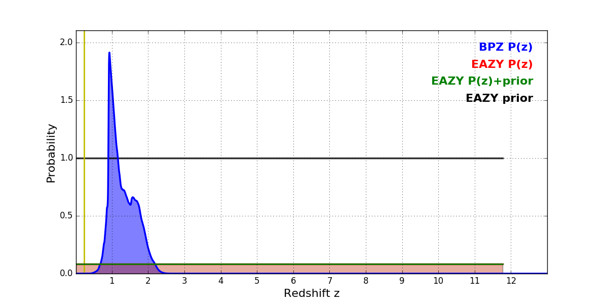 In P(z) plots: Yellow lines mark the cluster redshift z = 0.228,