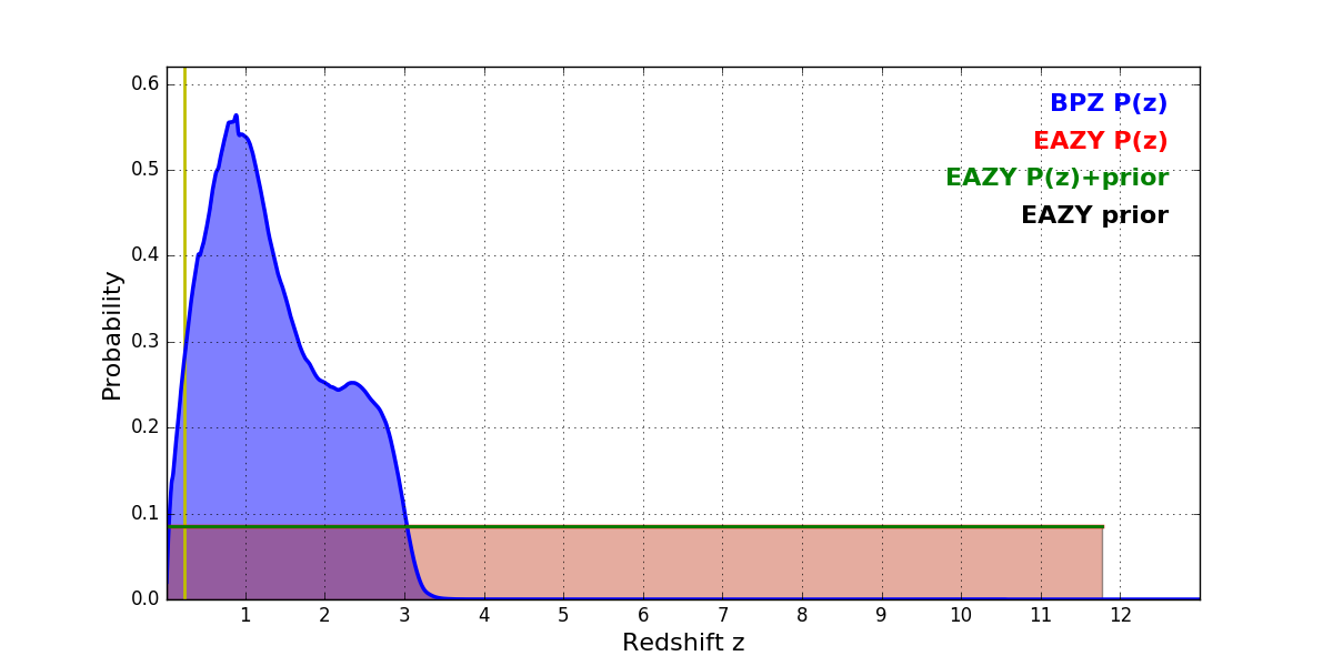 In P(z) plots: Yellow lines mark the cluster redshift z = 0.228,