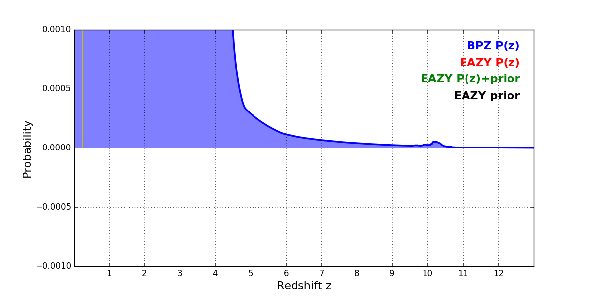 In P(z) plots: Yellow lines mark the cluster redshift z = 0.228,