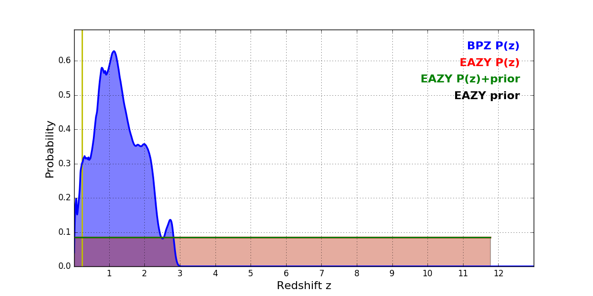 In P(z) plots: Yellow lines mark the cluster redshift z = 0.228,