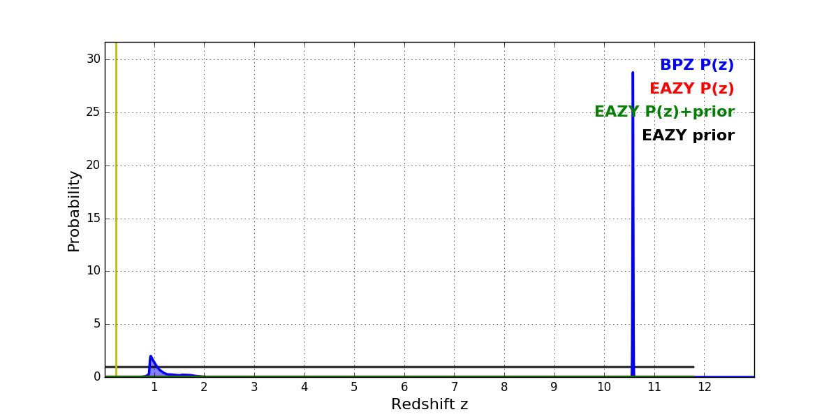 In P(z) plots: Yellow lines mark the cluster redshift z = 0.228,