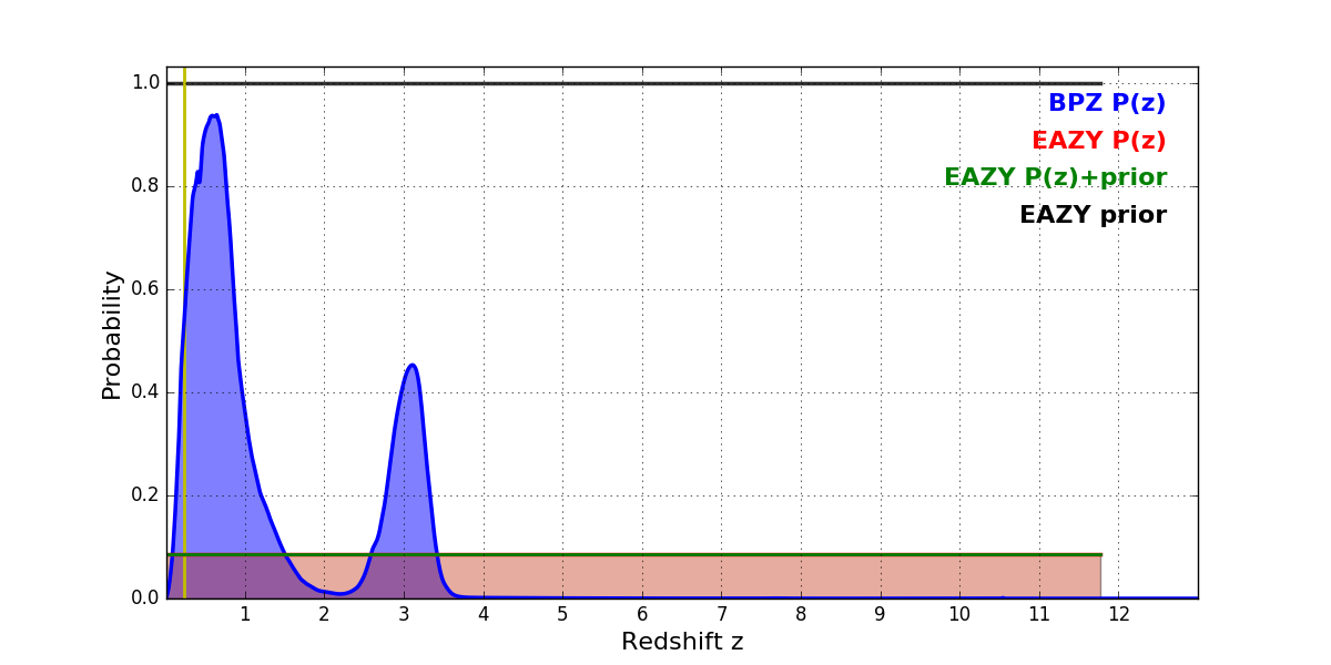 In P(z) plots: Yellow lines mark the cluster redshift z = 0.228,