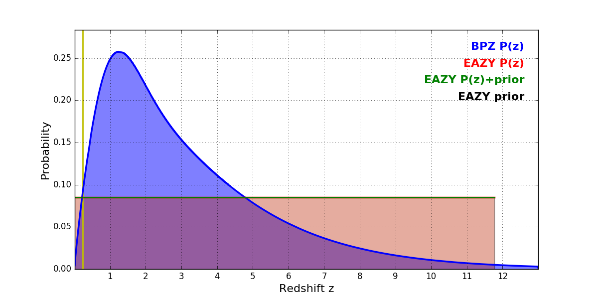 In P(z) plots: Yellow lines mark the cluster redshift z = 0.228,