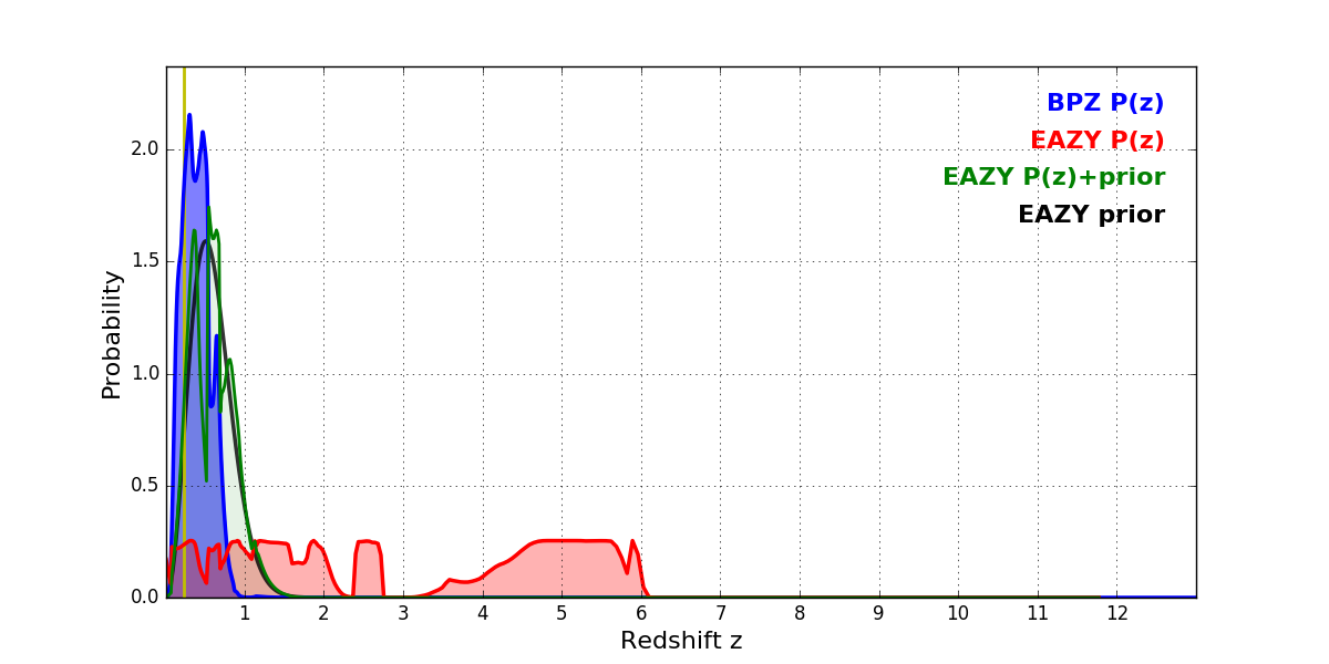 In P(z) plots: Yellow lines mark the cluster redshift z = 0.228,