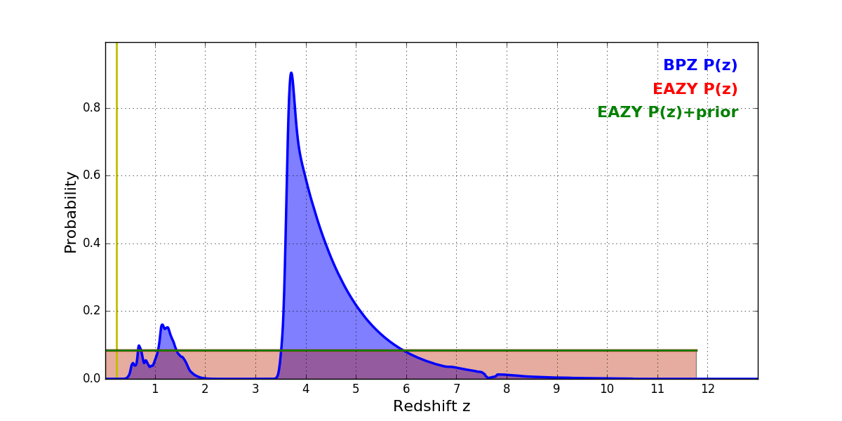In P(z) plots: Yellow lines mark the cluster redshift z = 0.228,