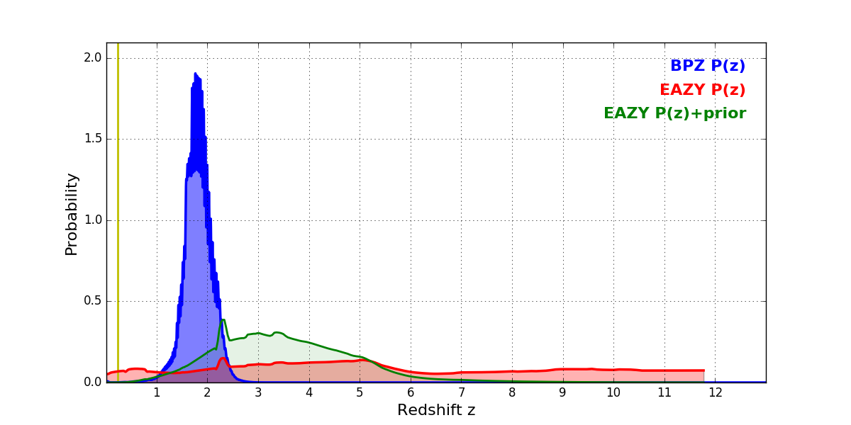 In P(z) plots: Yellow lines mark the cluster redshift z = 0.228,