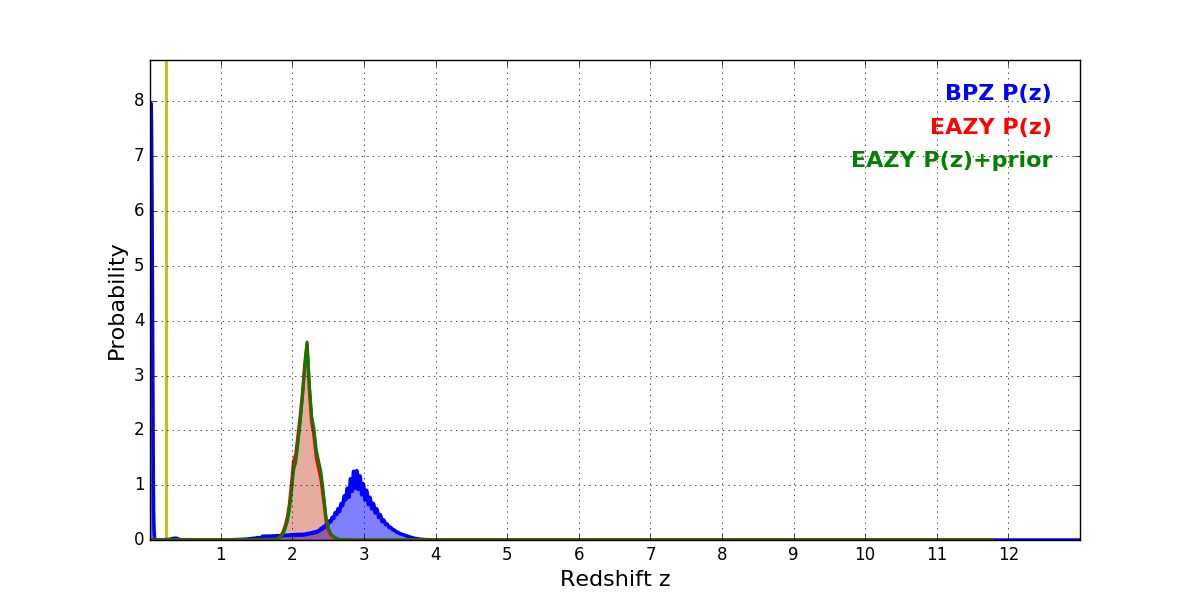 In P(z) plots: Yellow lines mark the cluster redshift z = 0.228,