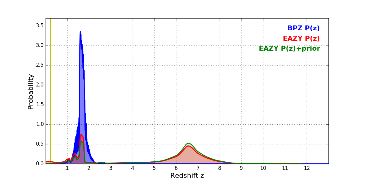 In P(z) plots: Yellow lines mark the cluster redshift z = 0.228,