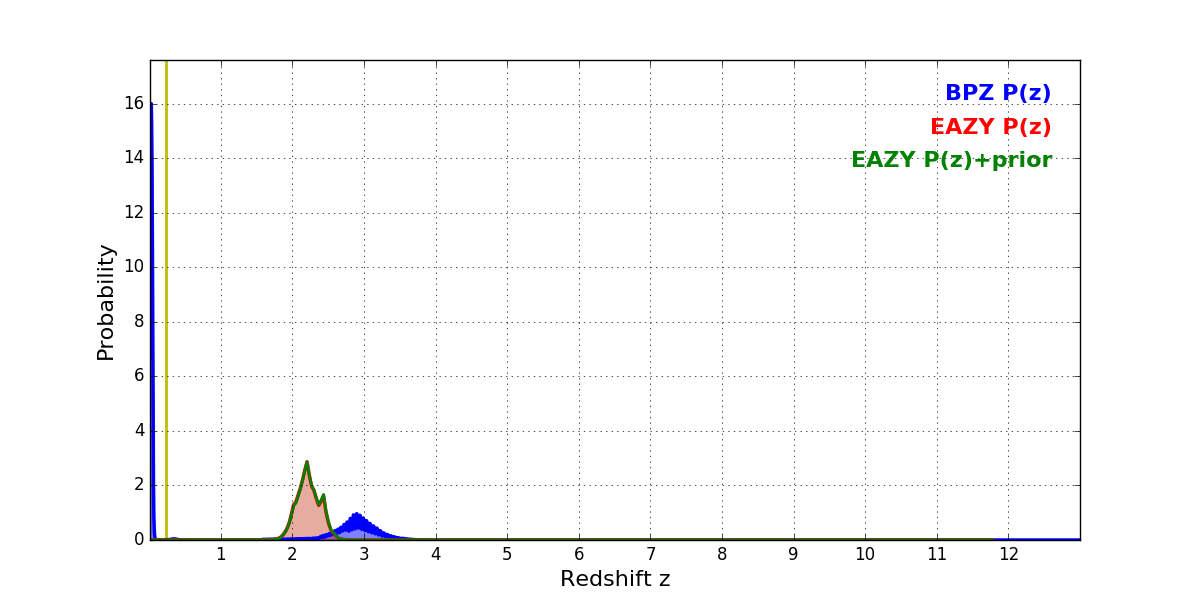 In P(z) plots: Yellow lines mark the cluster redshift z = 0.228,