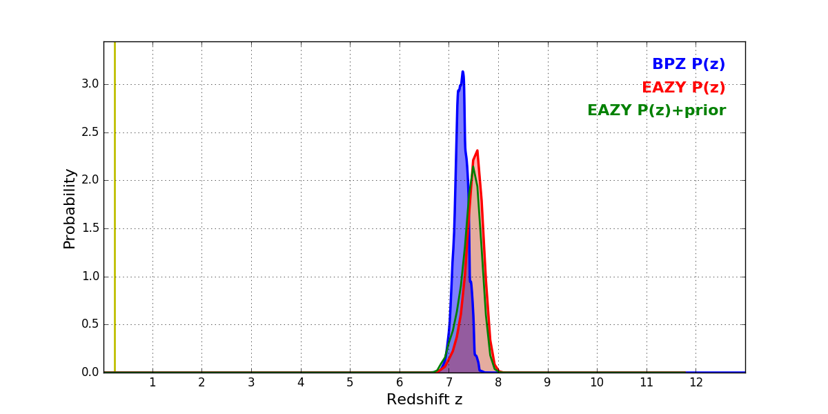 In P(z) plots: Yellow lines mark the cluster redshift z = 0.228,