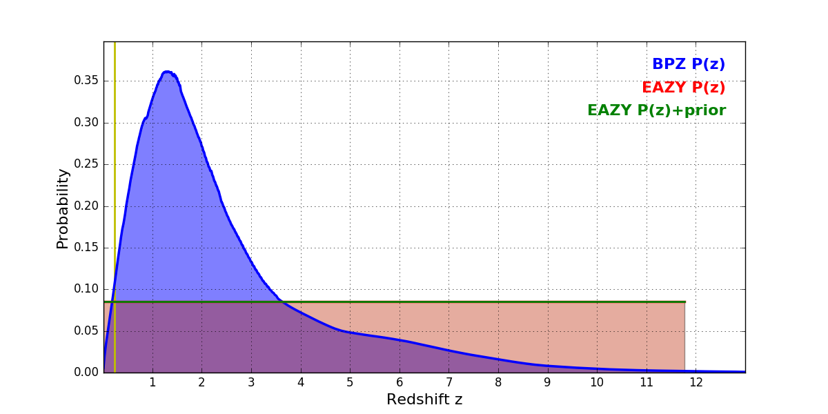 In P(z) plots: Yellow lines mark the cluster redshift z = 0.228,